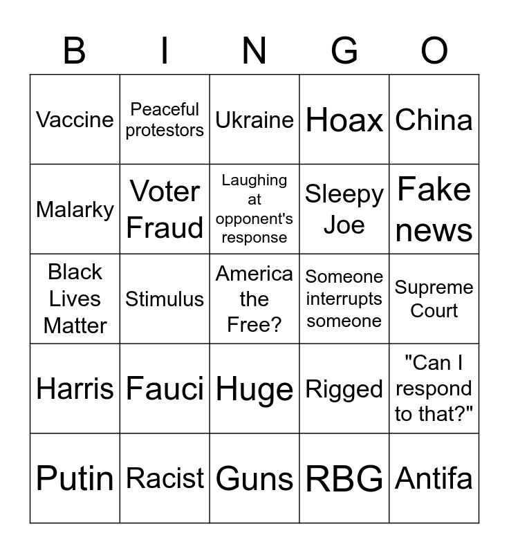 This bingo card has a free space and 44 words: Hunter, Antifa, Russia, Putin, Best, RBG, Ukraine, Taxes, China, Racist, Hoax, Someone interrupts someone, Huge, Fauci, 200,000, Guns, Mail In Ballots, Black Lives Matter, Folks, Fake news, Peaceful protestors, Socialism, Covid-19, Vaccine, Mask, Supreme Court, Obamacare, Make/ Keep America Great, Rigged, Harris, Police, "Can I respond to that?", Polls, Jobs, Stimulus, "people say", Trump talks about a sacrifice (ie masks at rallies), Biden tells a story, Laughing at opponent's response, Malarky, Sleepy Joe, Build Back Better, Voter Fraud and Stock Market.