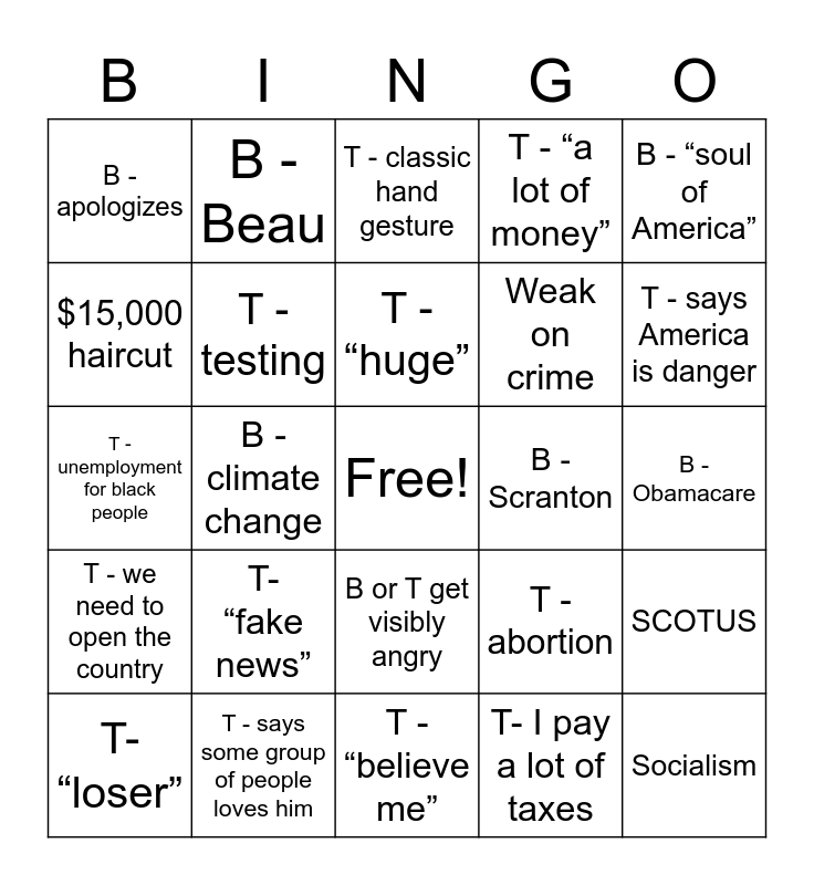 This bingo card has a free space and 24 words: T- “loser”, T- “fake news”, T - “huge”, T- I pay a lot of taxes, B - “soul of America”, B - apologizes, B - Beau, T - classic hand gesture, B - Scranton, B - Obamacare, T - unemployment for black people, T - testing, T - abortion, SCOTUS, $15,000 haircut, T - says some group of people loves him, T - “believe me”, T - “a lot of money”, T - says America is danger, T - we need to open the country, B - climate change, B or T get visibly angry, Weak on crime and Socialism.