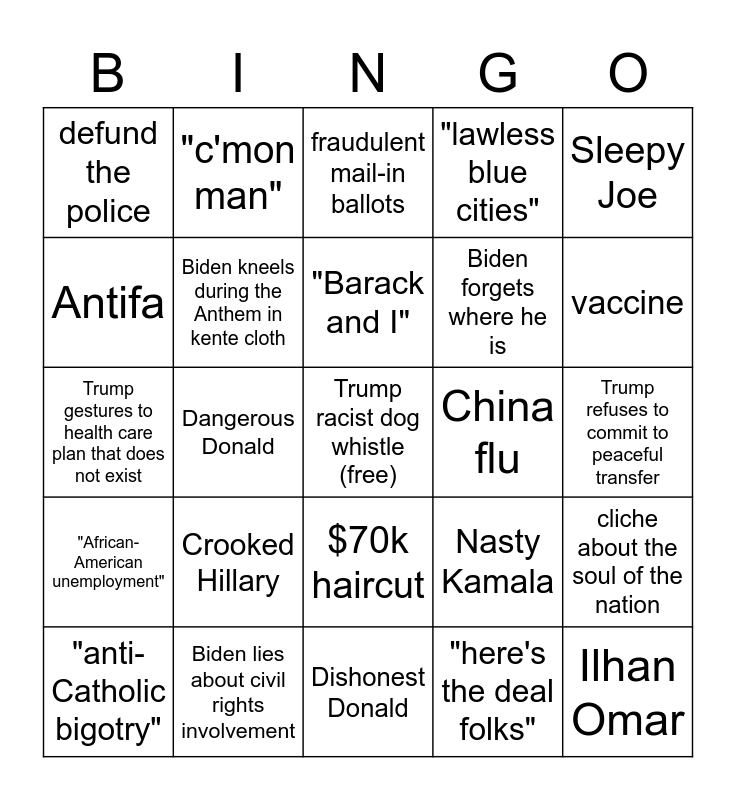 This bingo card has a free space and 24 words: Crooked Hillary, Biden lies about civil rights involvement, "Barack and I", "anti-Catholic bigotry", Sleepy Joe, defund the police, Antifa, "c'mon man", China flu, $70k haircut, Biden forgets where he is, Trump gestures to health care plan that does not exist, Nasty Kamala, cliche about the soul of the nation, Biden kneels during the Anthem in kente cloth, "here's the deal folks", Trump refuses to commit to peaceful transfer, fraudulent mail-in ballots, vaccine, Dangerous Donald, Ilhan Omar, "African-American unemployment", "lawless blue cities" and Dishonest Donald.