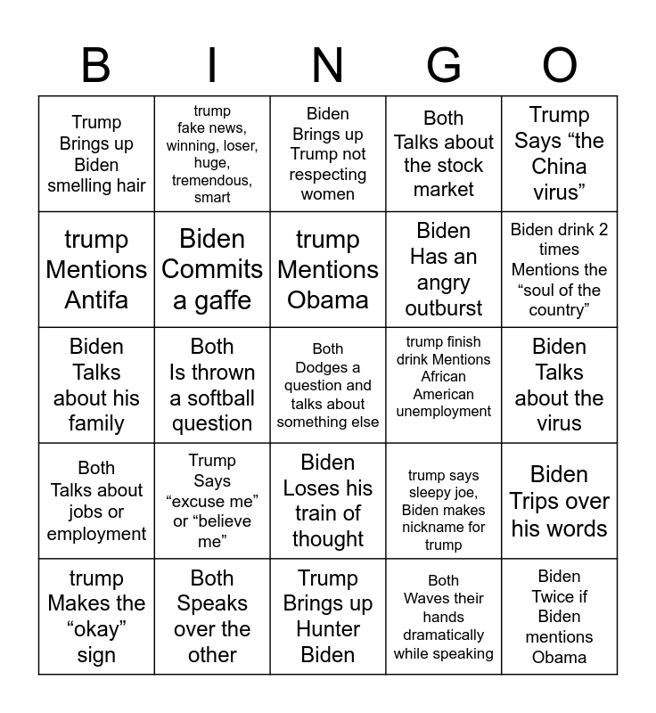 This bingo card has 25 words: Trump Says “excuse me” or “believe me”, Trump Brings up Hunter Biden, trump Mentions Obama, trump Makes the “okay” sign, Trump Says “the China virus”, Trump Brings up Biden smelling hair, trump Mentions Antifa, trump fake news, winning, loser, huge, tremendous, smart, trump finish drink Mentions African American unemployment, Biden Loses his train of thought, Biden Has an angry outburst, Biden Talks about his family, trump says sleepy joe, Biden makes nickname for trump, Biden Trips over his words, Biden Commits a gaffe, Biden Twice if Biden mentions Obama, Biden Talks about the virus, Biden Brings up Trump not respecting women, Biden drink 2 times Mentions the “soul of the country”, Both Is thrown a softball question, Both Dodges a question and talks about something else, Both Speaks over the other, Both Talks about jobs or employment, Both Talks about the stock market and Both Waves their hands dramatically while speaking.