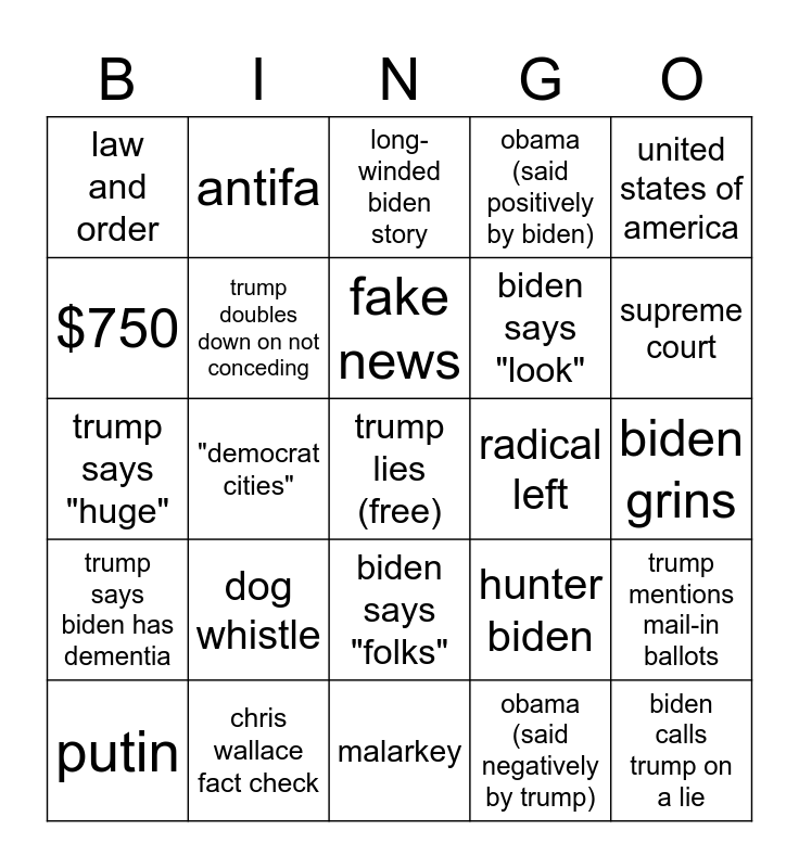 This bingo card has a free space and 25 words: dog whistle, malarkey, fake news, putin, united states of america, law and order, $750, antifa, radical left, biden says "folks", biden says "look", trump says "huge", hunter biden, trump mentions mail-in ballots, trump doubles down on not conceding, trump lies about covid, biden grins, long-winded biden story, supreme court, "democrat cities", biden calls trump on a lie, chris wallace fact check, trump says biden has dementia, obama (said positively by biden) and obama (said negatively by trump).