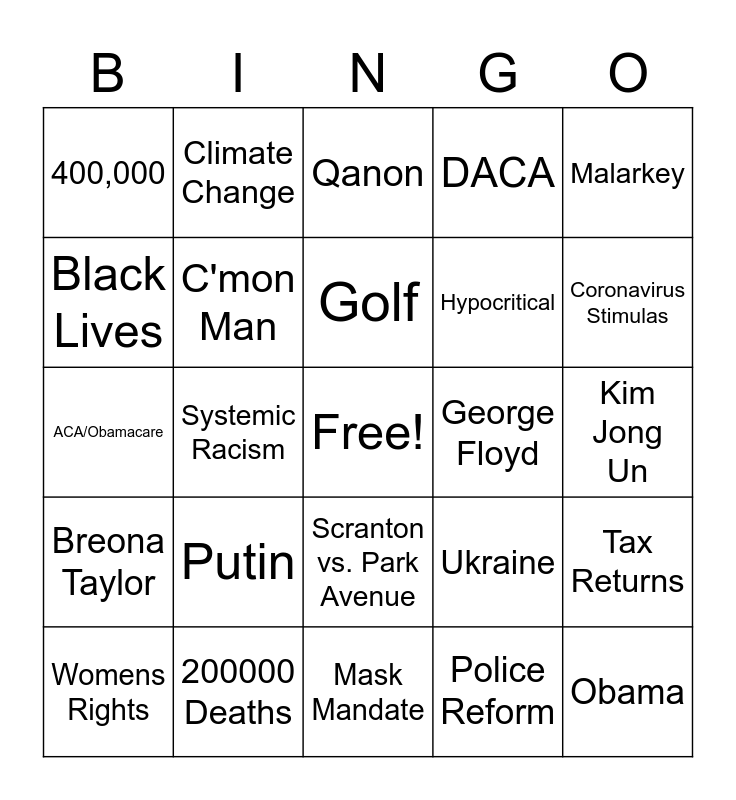 This bingo card has a free space and 28 words: Tax Returns, $750, Hypocritical, Police Reform, Black Lives, Qanon, Climate Change, Breona Taylor, George Floyd, Womens Rights, ACA/Obamacare, DACA, 200000 Deaths, Mask Mandate, Coronavirus Stimulas, Dr. Fauci, Putin, C'mon Man, Golf, Scranton vs. Park Avenue, 400,000, Right Wing Militia, Obama, Systemic Racism, Kim Jong Un, Ukraine, Malarkey and Preexisting Conditions.