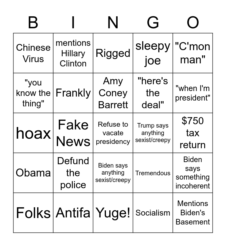 This bingo card has 31 words: Yuge!, Jyna, Fake News, Voter Fraud, Chinese Virus, Rigged, Frankly, Tremendous, Trump says anything sexist/creepy, Socialism, $750 tax return, Refuse to vacate presidency, Mentions Biden's Basement, Loses their train of thought, "when I'm president", Russia, Biden says something incoherent, Defund the police, Obama, Biden says anything sexist/creepy, "C'mon man", Malarkey, Folks, mentions Hillary Clinton, "here's the deal", "you know the thing", sleepy joe, hoax, Antifa, Amy Coney Barrett and Jill or Hunter Biden.