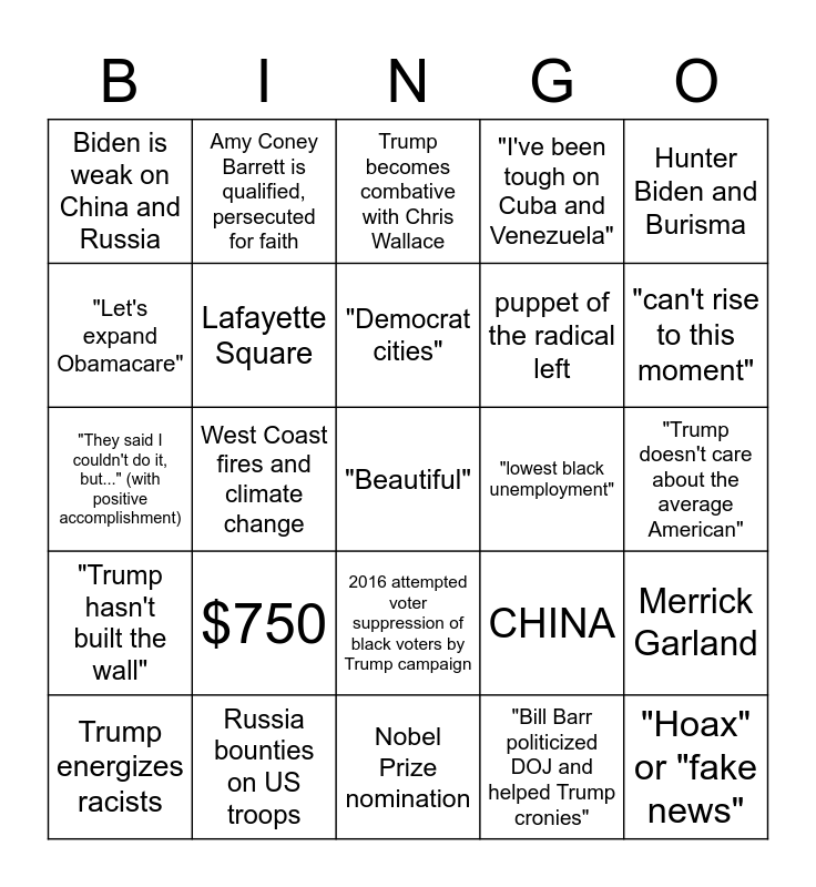 This bingo card has a free space and 24 words: $750, Russia bounties on US troops, "Democrat cities", Trump energizes racists, Hunter Biden and Burisma, Biden is weak on China and Russia, "Let's expand Obamacare", Amy Coney Barrett is qualified, persecuted for faith, "lowest black unemployment", 2016 attempted voter suppression of black voters by Trump campaign, puppet of the radical left, "They said I couldn't do it, but..." (with positive accomplishment), CHINA, Merrick Garland, Lafayette Square, "Bill Barr politicized DOJ and helped Trump cronies", "Trump doesn't care about the average American", Trump becomes combative with Chris Wallace, "can't rise to this moment", West Coast fires and climate change, "Hoax" or "fake news", "Trump hasn't built the wall", "I've been tough on Cuba and Venezuela" and Nobel Prize nomination.