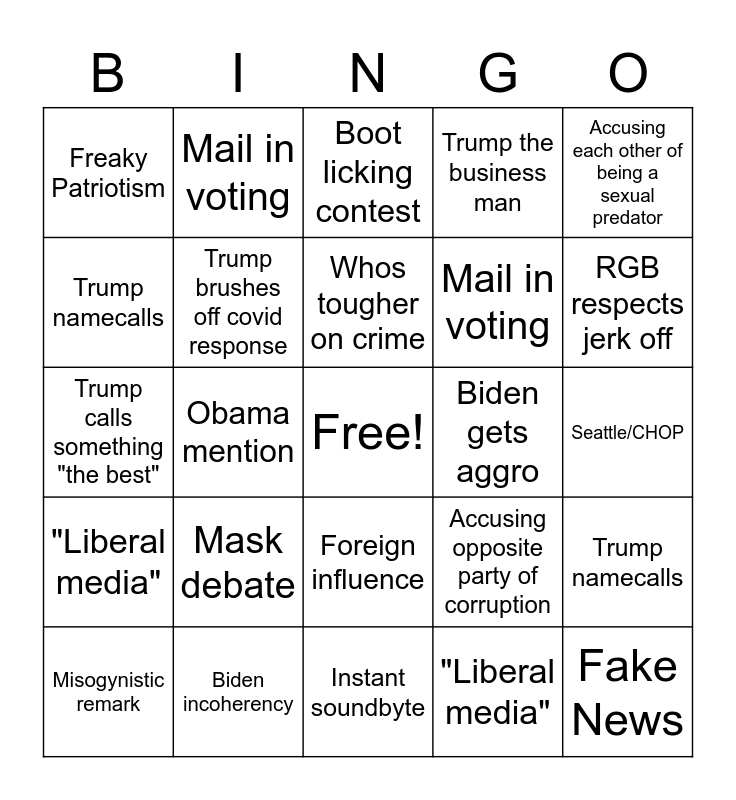 This bingo card has a free space and 28 words: Trump namecalls, Boot licking contest, Mail in voting, "Liberal media", Trump namecalls, Boot licking contest, Mail in voting, "Liberal media", Biden gets aggro, Misogynistic remark, Trump calls something "the best", Trump the business man, Biden incoherency, Instant soundbyte, RGB respects jerk off, Violent anarchists/antifa, Mask debate, Trump brushes off covid response, Whos tougher on crime, Foreign influence, Freaky Patriotism, Dogwhistle, Fake News, Obama mention, Seattle/CHOP, Accusing opposite party of corruption, Accusing each other of being a sexual predator and Dementia Battle.