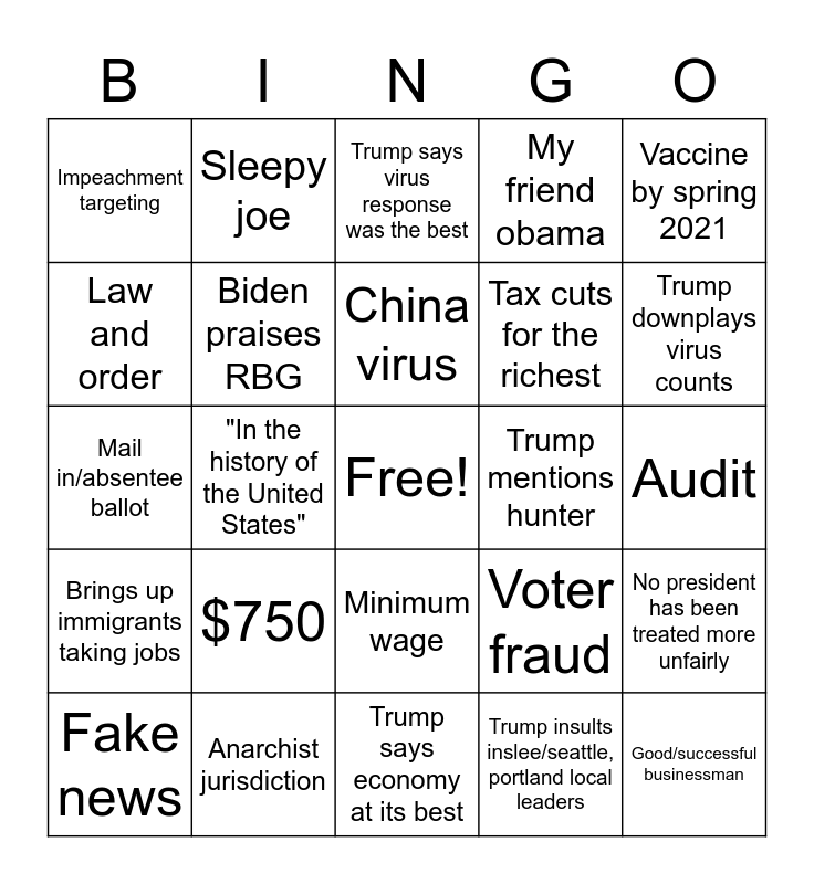 This bingo card has a free space and 24 words: $750, Anarchist jurisdiction, China virus, Fake news, Vaccine by spring 2021, Impeachment targeting, Law and order, Sleepy joe, Trump mentions hunter, Minimum wage, Tax cuts for the richest, Mail in/absentee ballot, Voter fraud, No president has been treated more unfairly, Biden praises RBG, Trump insults inslee/seattle, portland local leaders, Audit, Trump says virus response was the best, Trump downplays virus counts, "In the history of the United States", Good/successful businessman, Brings up immigrants taking jobs, My friend obama and Trump says economy at its best.