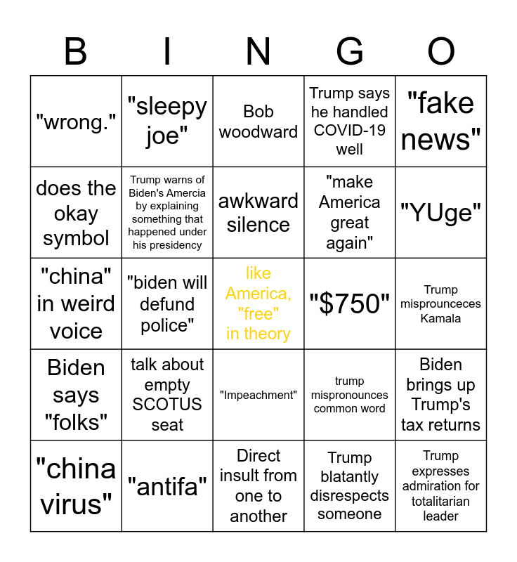 This bingo card has a free space and 24 words: talk about empty SCOTUS seat, "antifa", awkward silence, "china virus", "fake news", "wrong.", does the okay symbol, "sleepy joe", "$750", "Impeachment", "make America great again", "china" in weird voice, trump mispronounces common word, Biden brings up Trump's tax returns, Trump warns of Biden's Amercia by explaining something that happened under his presidency, Trump blatantly disrespects someone, Trump misprounceces Kamala, Bob woodward, "YUge", "biden will defund police", Trump expresses admiration for totalitarian leader, Biden says "folks", Trump says he handled COVID-19 well and Direct insult from one to another.