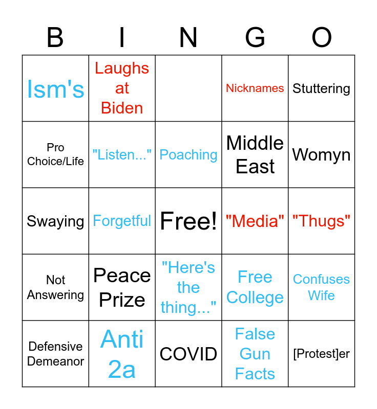 This bingo card has a free space and 39 words: Hand Gesture, Pursed Lips, O Face, "Listen...", Defensive Demeanor, "Here's the thing...", Poaching, Yelling, Stuttering, Not Answering, Forgetful, Nicknames, [Protest]er, "Thugs", "Media", Peace Prize, Police, Ism's, Immigration, Free College, Pro Choice/Life, COVID, Middle East, Womyn, Economy, China, Goof, Train of thought, Hair Flutter, Laughs at Biden, "Yuge", "C'mon Man!", Mispronounce, Anti 2a, False Gun Facts, VP/Obama reference, Confuses Wife, Swaying and Eye contact.