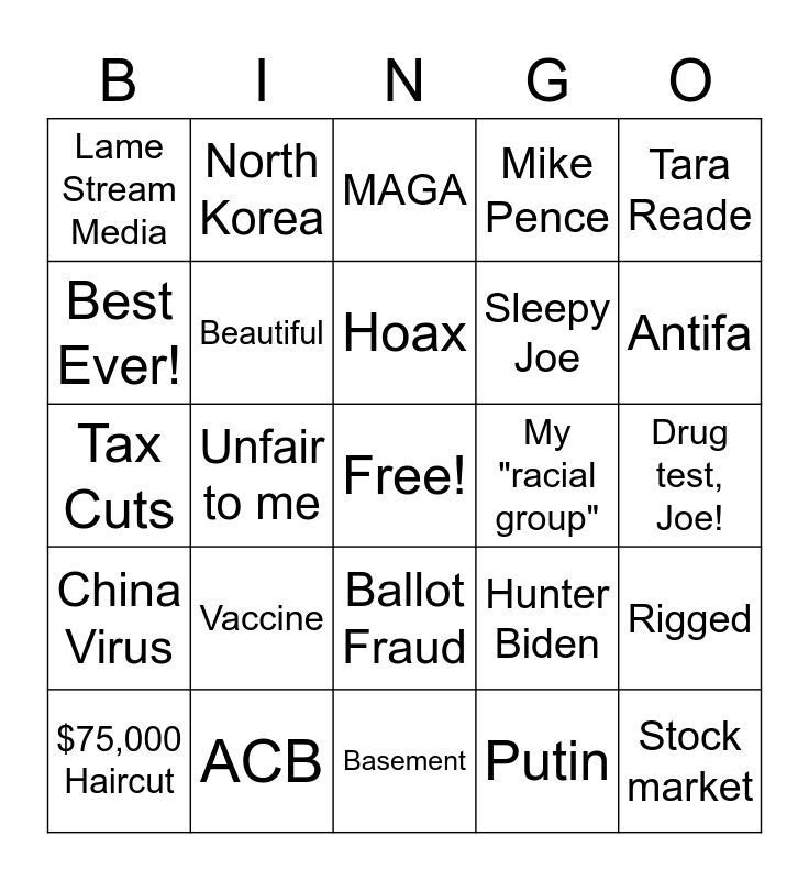 This bingo card has a free space and 29 words: $75,000 Haircut, Thugs, Unfair to me, America First, Lame Stream Media, MAGA, Beautiful, Vaccine, My "racial group", ACB, Drug test, Joe!, Stock market, Basement, Putin, Antifa, Sad!, Ballot Fraud, China Virus, Tara Reade, Tax Cuts, Hunter Biden, Witch Hunt, Sleepy Joe, Best Ever!, Mike Pence, North Korea, Rigged, Hoax and Crooked Hillary.
