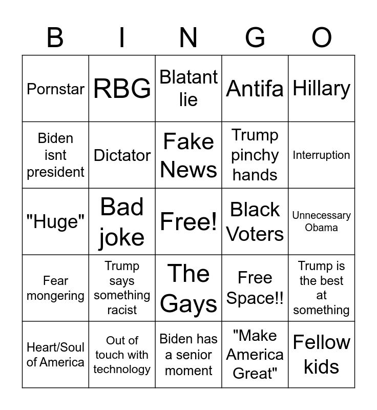 This bingo card has a free space and 25 words: Trump says something racist, Biden has a senior moment, Fake News, Heart/Soul of America, Hillary, Pornstar, Biden isnt president, RBG, Black Voters, The Gays, Trump pinchy hands, "Huge", Free Space!!, Trump is the best at something, Dictator, "Folks", Unnecessary Obama, Blatant lie, Interruption, Bad joke, Fellow kids, Out of touch with technology, Fear mongering, Antifa and "Make America Great".
