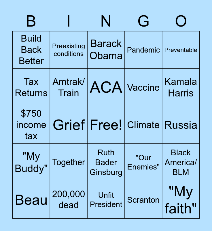 This bingo card has a free space and 26 words: Ruth Bader Ginsburg, Scranton, ACA, 200,000 dead, Preventable, Build Back Better, Tax Returns, Preexisting conditions, Russia, "Our Enemies", Vaccine, $750 income tax, Black America/ BLM, Beau, Grief, Job Loss, Pandemic, "My Buddy", Barack Obama, "My faith", Kamala Harris, Unfit President, Climate, Together, Amtrak/ Train and Transition.