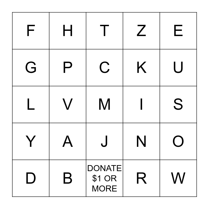 This bingo card has a free space and 24 words: A, B, C, D, E, F, G, H, I, J, K, L, N, O, P, R, S, T, U, V, W, Y, Z and DONATE $1 OR MORE.