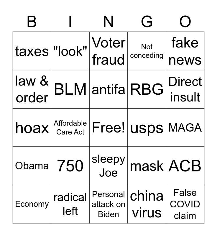 This bingo card has a free space and 26 words: sleepy Joe, china virus, antifa, radical left, fake news, taxes, law & order, "look", MAGA, mask, RBG, hoax, ACB, Economy, Affordable Care Act, Anarchy, Not conceding, Obama, Voter fraud, False COVID claim, Direct insult, Personal attack on Biden, usps, 750, BLM and performance enhancing drugs.