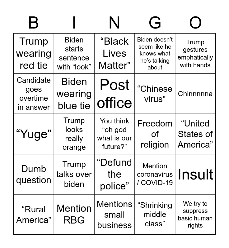 This bingo card has 25 words: Trump talks over biden, Mentions small business, Post office, “Rural America”, Trump gestures emphatically with hands, Trump wearing red tie, Candidate goes overtime in answer, Biden starts sentence with “look”, Freedom of religion, “Defund the police”, “Chinese virus”, “Yuge”, Mention coronavirus / COVID-19, Insult, Biden wearing blue tie, We try to suppress basic human rights, “United States of America”, “Black Lives Matter”, Chinnnnna, Trump looks really orange, You think “oh god what is our future?”, Mention RBG, Dumb question, Biden doesn’t seem like he knows what he’s talking about and “Shrinking middle class”.