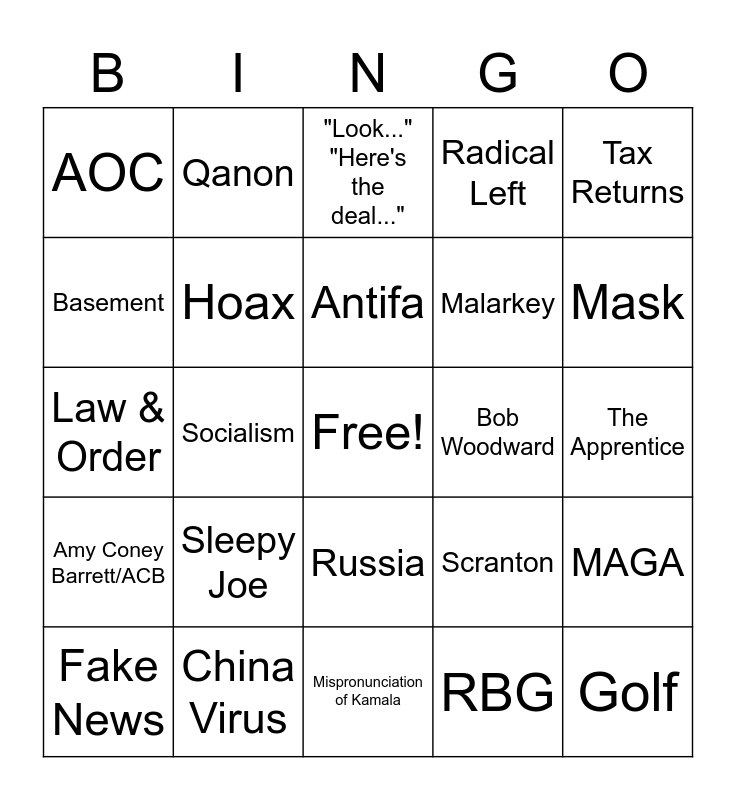 This bingo card has a free space and 24 words: Sleepy Joe, China Virus, Antifa, Fake News, Tax Returns, AOC, Basement, Qanon, Bob Woodward, Russia, Malarkey, Law & Order, Scranton, MAGA, Hoax, RBG, The Apprentice, "Look..." "Here's the deal...", Mask, Socialism, Golf, Amy Coney Barrett/ACB, Radical Left and Mispronunciation of Kamala.