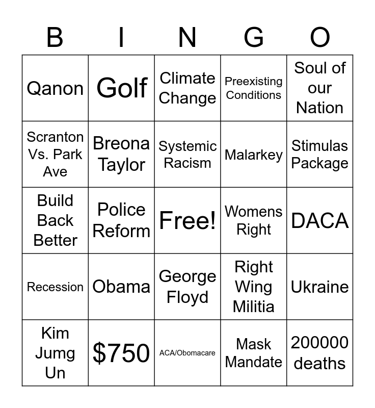 This bingo card has a free space and 30 words: $750, Hypocritical, Police Reform, Black Lives, Qanon, Climate Change, Breona Taylor, George Floyd, Womens Right, ACA/Obomacare, DACA, 200000 deaths, Mask Mandate, Coromavirus, Stimulas Package, Dr Fauci, Right Wing Militia, Recession, Obama, Soul of our Nation, Build Back Better, Putin, Golf, Malarkey, Scranton Vs. Park Ave, Preexisting Conditions, Ukraine, Kim Jumg Un, Systemic Racism and ives.