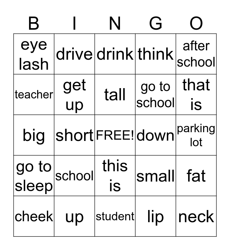 This bingo card has a free space and 24 words: school, up, tall, cheek, after school, eye lash, teacher, drive, down, this is, go to school, big, small, fat, get up, lip, parking lot, drink, that is, short, neck, go to sleep, think and student.