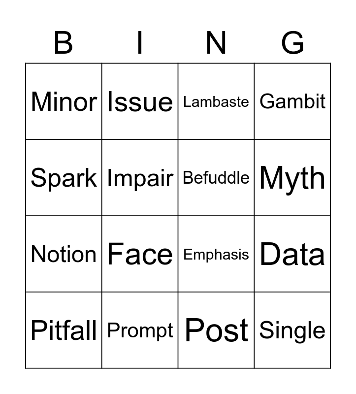 This bingo card has 16 words: Prompt, Data, Lambaste, Minor, Notion, Issue, Emphasis, Post, Spark, Impair, Pitfall, Gambit, Face, Myth, Befuddle and Single.