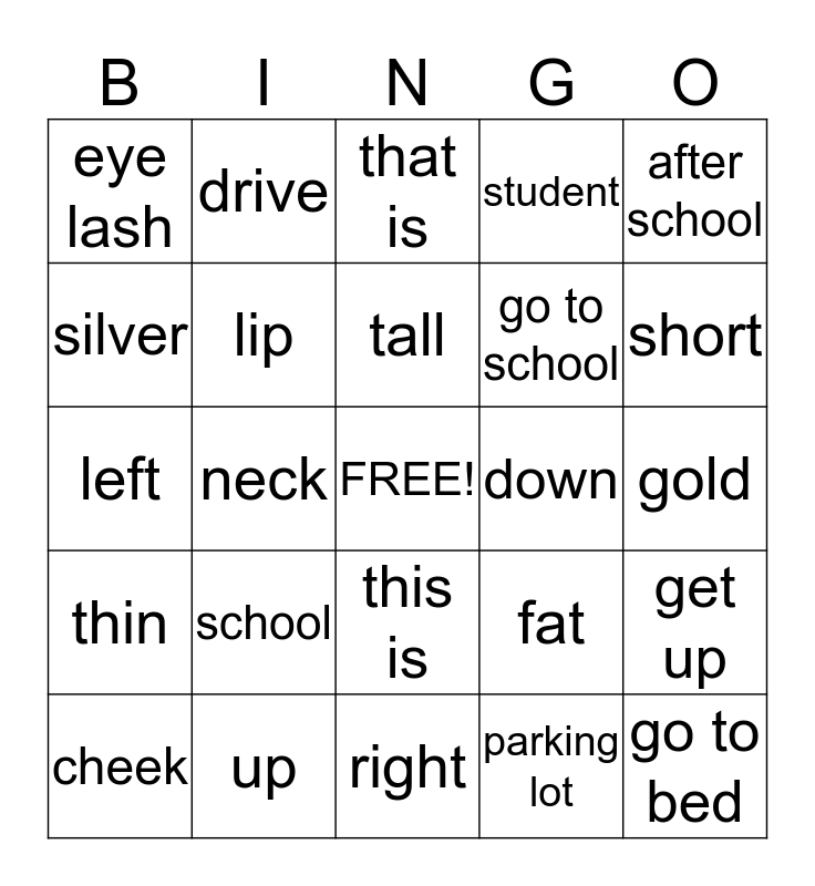 This bingo card has a free space and 24 words: school, up, tall, cheek, after school, eye lash, silver, drive, down, this is, go to school, left, fat, get up, lip, parking lot, gold, that is, short, neck, go to bed, thin, student and right.