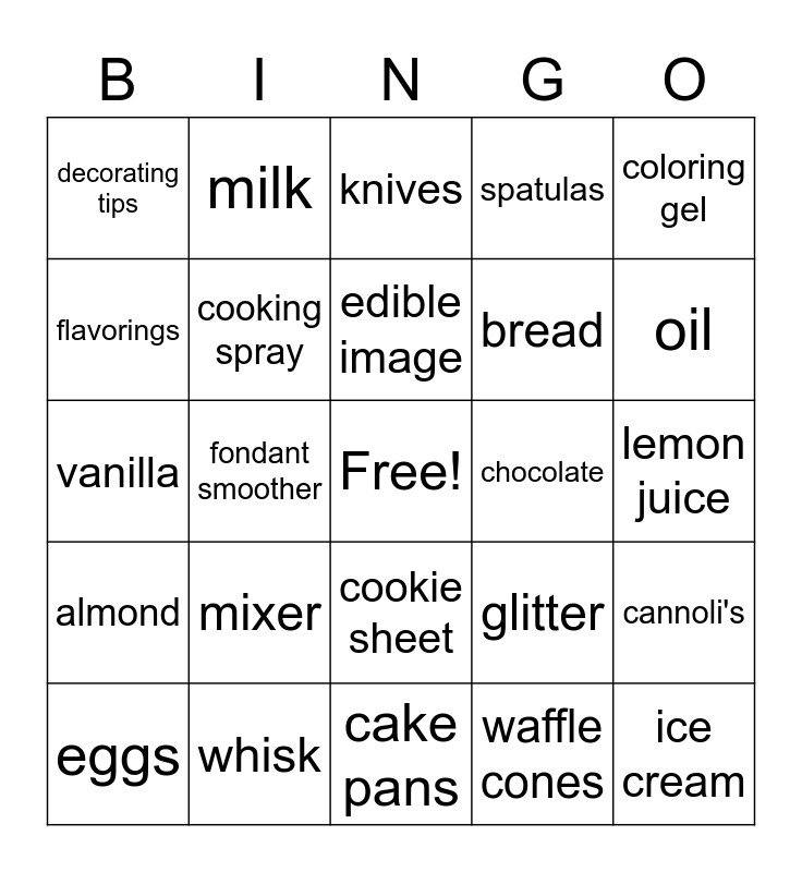 This bingo card has a free space and 94 words: meausing cups, scissors, cake pans, cupcakes, sprinkles, flour, cake mix, eggs, fondant, boxes, cupcake liners, apron, donuts, bread, towel, coloring gel, knives, rolling pin, oven mitten, freezer, table, foil, speedrack, fruit filling, mixer, cooking spray, cupcake scooper, scale, chef hat, chef coat, whisk, cookie sheet, parchment paper, spring pan, milk, cake stand, chocolate drip, stencils, edible image, glitter, vanilla, almond, lemon juice, chocolate chips, ice cream, shakes, caramel, hot fudge, peanut butter, whipped cream, cherries, waffle cones, cake cones, sugar cones, teaspoon, tablespoon, ganache, unsalted butter, candy, paint brushes, fondant smoother, angled spatula, tapered spatula, flower nail, gum paste, cmc powdered, chocolate candy molds, candy melts, flavorings, ziploc bags, measing spoons, fridge, oven, character pans, spatulas, sugar, cookies, oil, cannoli's, baking powdered, baking soda, buttercream, sweetex, chocolate, decorating tips, airbrush machine, projector, cake boards, pie, decorating bags, macaroons, popcorn, bag and trays.