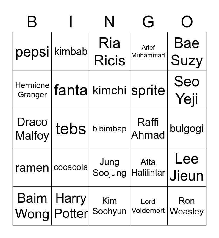 This bingo card has a free space and 24 words: cocacola, Harry Potter, kimchi, Baim Wong, Bae Suzy, pepsi, Hermione Granger, kimbab, Raffi Ahmad, Jung Soojung, sprite, Draco Malfoy, Atta Halilintar, Lee Jieun, fanta, Lord Voldemort, bulgogi, Ria Ricis, Seo Yeji, tebs, Ron Weasley, ramen, Arief Muhammad and Kim Soohyun.