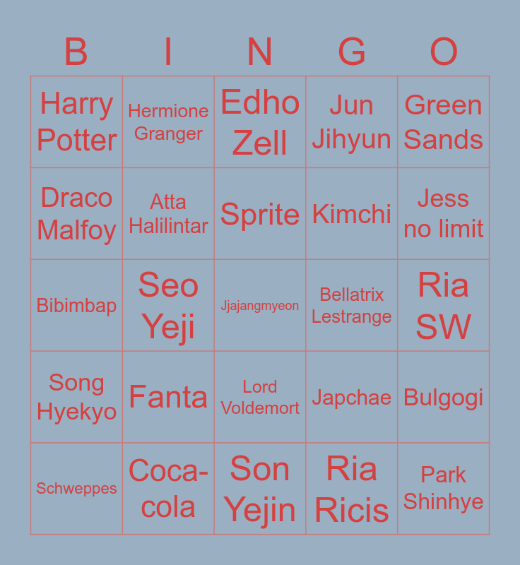 This bingo card has a free space and 24 words: Fanta, Coca-cola, Sprite, Schweppes, Green Sands, Harry Potter, Draco Malfoy, Hermione Granger, Bellatrix Lestrange, Lord Voldemort, Kimchi, Bibimbap, Japchae, Bulgogi, Atta Halilintar, Ria Ricis, Ria SW, Edho Zell, Jess no limit, Seo Yeji, Park Shinhye, Song Hyekyo, Jun Jihyun and Son Yejin.
