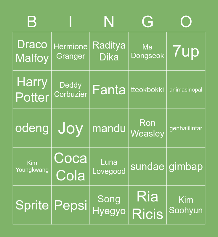 This bingo card has a free space and 24 words: Coca Cola, Pepsi, Fanta, Sprite, 7up, Draco Malfoy, Harry Potter, Hermione Granger, Ron Weasley, Luna Lovegood, tteokbokki, odeng, sundae, gimbap, Deddy Corbuzier, Ria Ricis, genhalilintar, Raditya Dika, animasinopal, Joy, Kim Soohyun, Kim Youngkwang, Ma Dongseok and Song Hyegyo.