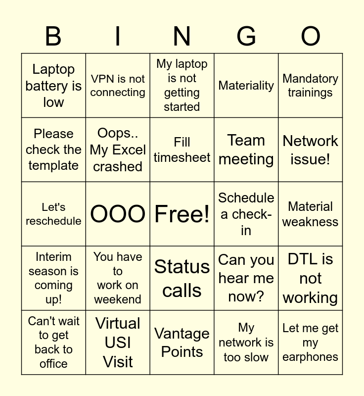 This bingo card has a free space and 24 words: You have to work on weekend, Virtual USI Visit, Fill timesheet, Can't wait to get back to office, Mandatory trainings, Laptop battery is low, Please check the template, VPN is not connecting, Schedule a check-in, Status calls, Team meeting, Let's reschedule, Can you hear me now?, DTL is not working, Oops.. My Excel crashed, My network is too slow, Material weakness, My laptop is not getting started, Network issue!, OOO, Let me get my earphones, Interim season is coming up!, Materiality and Vantage Points.
