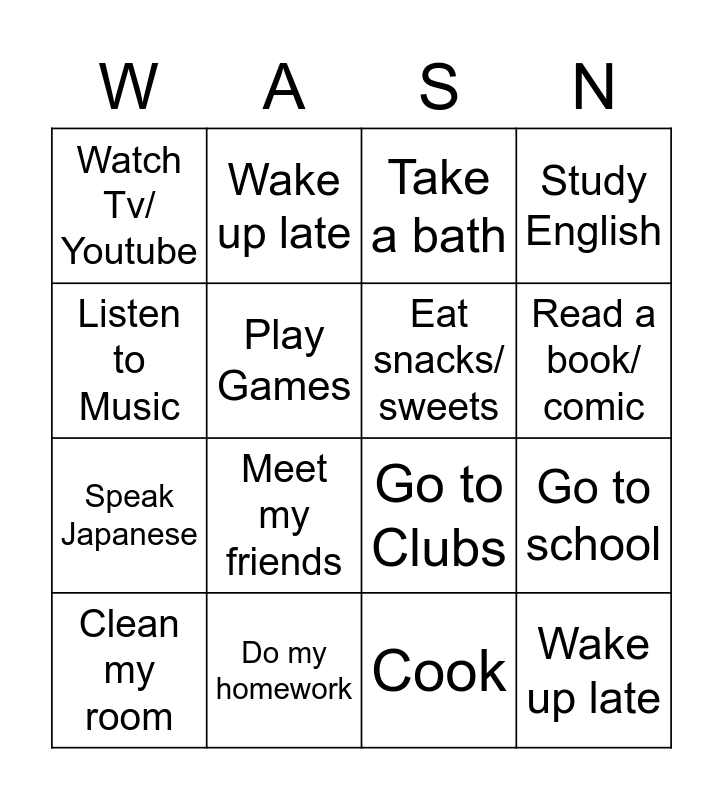 This bingo card has 16 words: Do my homework, Go to school, Take a bath, Watch Tv/ Youtube, Speak Japanese, Wake up late, Go to Clubs, Cook, Listen to Music, Play Games, Clean my room, Study English, Meet my friends, Read a book/ comic, Eat snacks/ sweets and Wake up late.