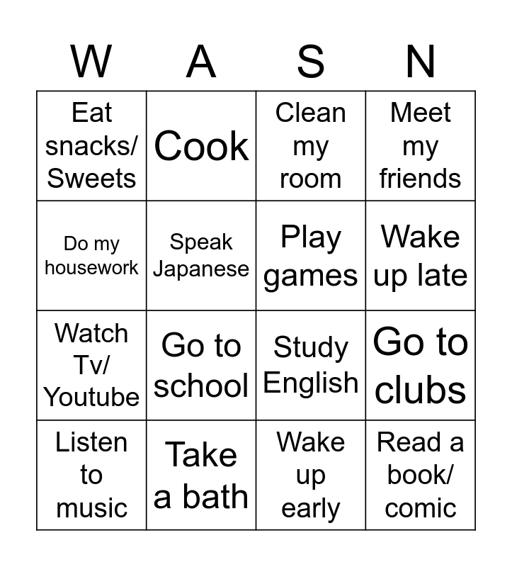 This bingo card has 16 words: Take a bath, Go to clubs, Clean my room, Eat snacks/ Sweets, Watch Tv/ Youtube, Cook, Study English, Wake up early, Do my housework, Speak Japanese, Listen to music, Meet my friends, Go to school, Wake up late, Play games and Read a book/ comic.