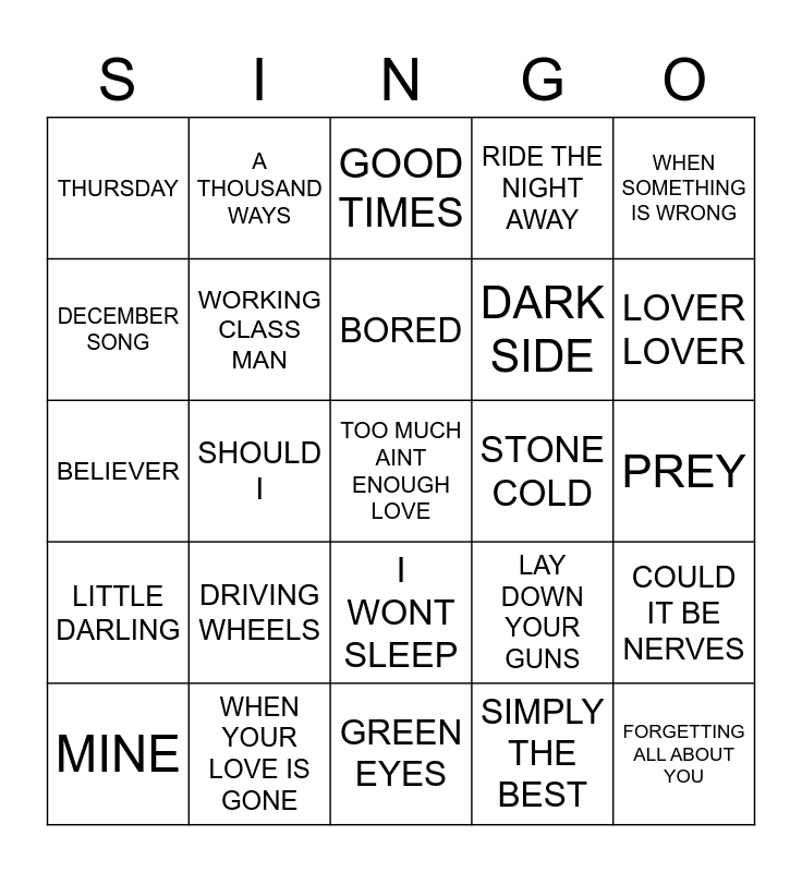 This bingo card has 25 words: DRIVING WHEELS, GREEN EYES, BORED, MINE, WHEN SOMETHING IS WRONG, THURSDAY, DECEMBER SONG, A THOUSAND WAYS, STONE COLD, I WONT SLEEP, DARK SIDE, BELIEVER, LAY DOWN YOUR GUNS, COULD IT BE NERVES, WORKING CLASS MAN, FORGETTING ALL ABOUT YOU, PREY, GOOD TIMES, LOVER LOVER, SHOULD I, TOO MUCH AINT ENOUGH LOVE, WHEN YOUR LOVE IS GONE, LITTLE DARLING, RIDE THE NIGHT AWAY and SIMPLY THE BEST.
