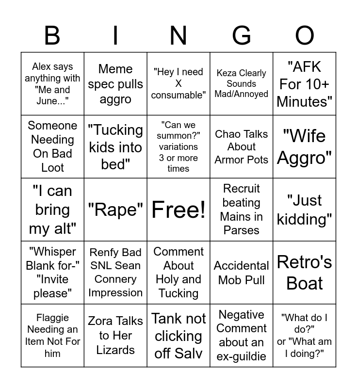 This bingo card has a free space and 24 words: Renfy Bad SNL Sean Connery Impression, Zora Talks to Her Lizards, "Can we summon?" variations 3 or more times, Flaggie Needing an Item Not For him, "AFK For 10+ Minutes", Alex says anything with "Me and June...", Someone Needing On Bad Loot, Meme spec pulls aggro, Recruit beating Mains in Parses, Comment About Holy and Tucking, Chao Talks About Armor Pots, "I can bring my alt", Accidental Mob Pull, Retro's Boat, "Tucking kids into bed", Negative Comment about an ex-guildie, "Just kidding", "Hey I need X consumable", "Wife Aggro", "Rape", "What do I do?" or "What am I doing?", "Whisper Blank for-" "Invite please", Keza Clearly Sounds Mad/Annoyed and Tank not clicking off Salv.