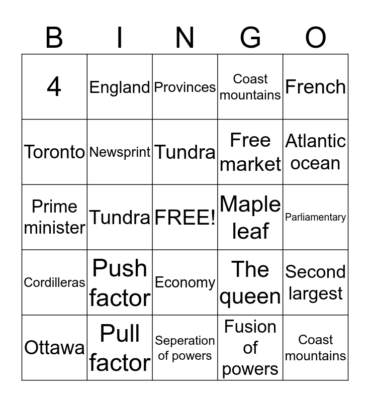 This bingo card has a free space and 24 words: Push factor, Pull factor, Tundra, Ottawa, French, 4, Toronto, England, Maple leaf, Economy, Free market, Prime minister, The queen, Second largest, Newsprint, Fusion of powers, Parliamentary, Provinces, Atlantic ocean, Tundra, Coast mountains, Cordilleras, Coast mountains and Seperation of powers.