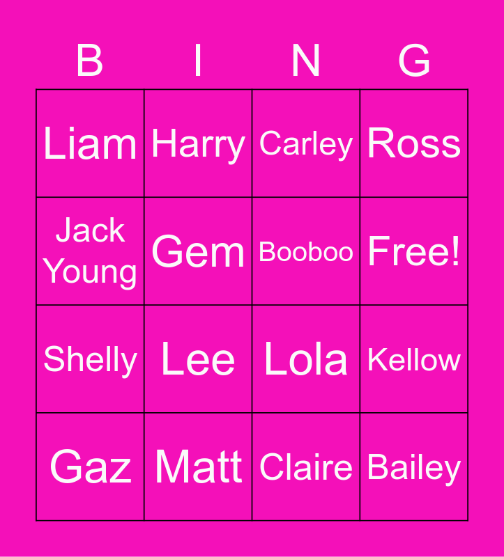 This bingo card has 17 words: Claire, Gaz, Carley, Liam, Lee, Ross, Kellow, Booboo, Free!, Gem, Matt, Lola, Jack Young, Harry, Shelly, Logan and Bailey.
