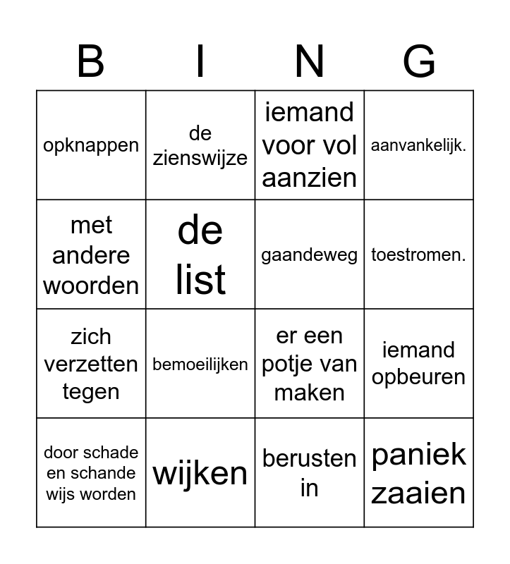 This bingo card has 16 words: wijken, iemand opbeuren, iemand voor vol aanzien, opknappen, zich verzetten tegen, de zienswijze, er een potje van maken, berusten in, met andere woorden, de list, door schade en schande wijs worden, aanvankelijk., bemoeilijken, toestromen., gaandeweg and paniek zaaien.