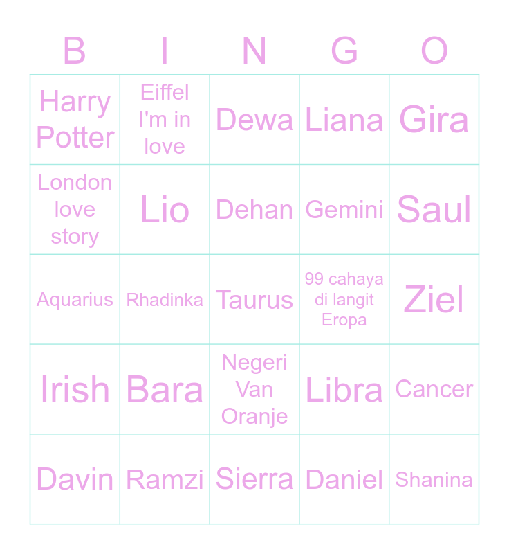 This bingo card has a free space and 24 words: Bara, Ramzi, Dehan, Davin, Gira, Harry Potter, London love story, Eiffel I'm in love, 99 cahaya di langit Eropa, Negeri Van Oranje, Gemini, Aquarius, Libra, Cancer, Lio, Daniel, Ziel, Dewa, Saul, Rhadinka, Shanina, Irish, Liana and Sierra.