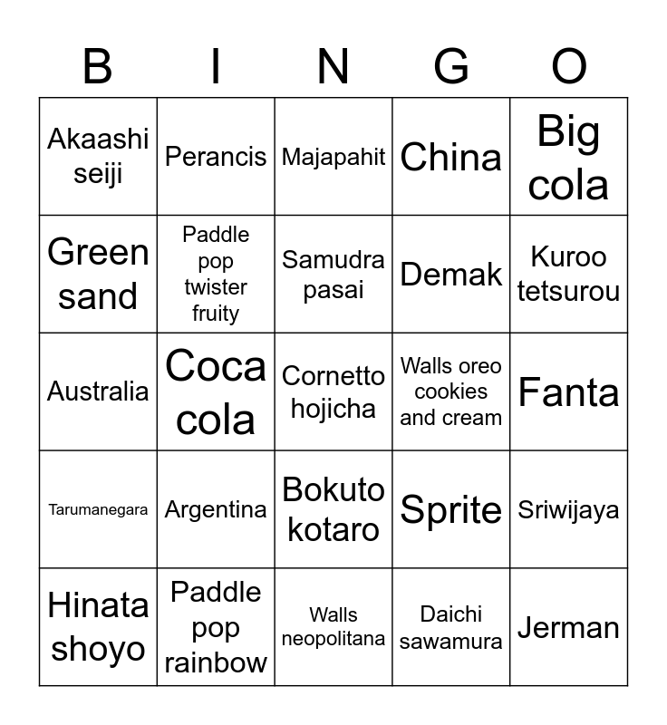 This bingo card has a free space and 24 words: Argentina, Paddle pop rainbow, Samudra pasai, Hinata shoyo, Big cola, Akaashi seiji, Green sand, Perancis, Walls oreo cookies and cream, Bokuto kotaro, Demak, Australia, Sprite, Sriwijaya, Paddle pop twister fruity, Daichi sawamura, Fanta, Majapahit, Kuroo tetsurou, Coca cola, Jerman, Tarumanegara, China and Walls neopolitana.