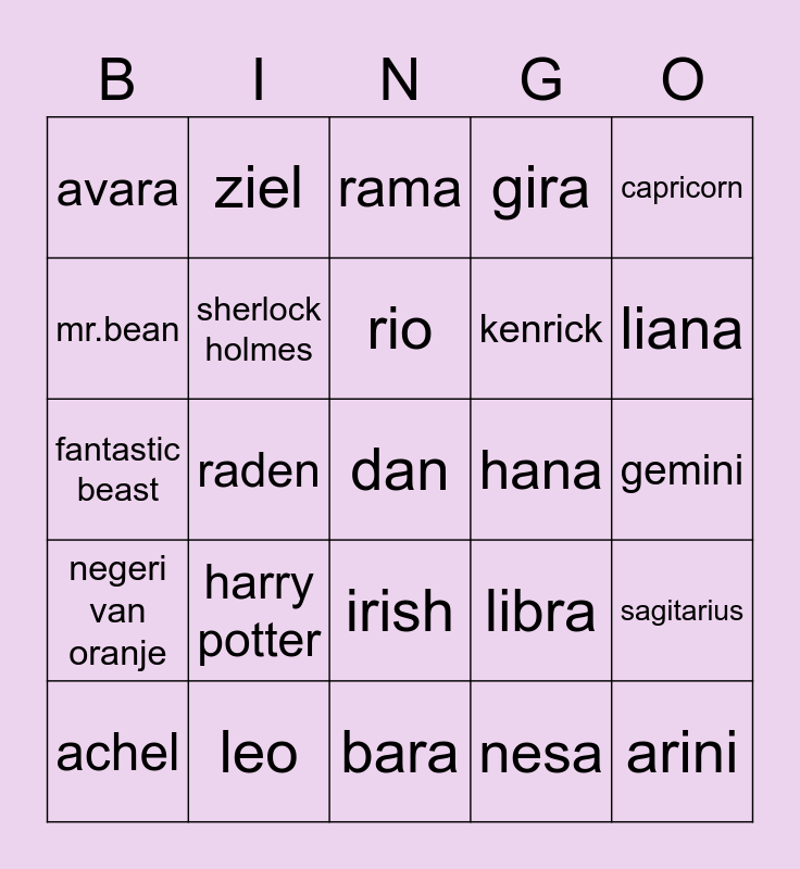 This bingo card has a free space and 24 words: achel, harry potter, rio, nesa, capricorn, avara, ziel, rama, hana, gemini, fantastic beast, sherlock holmes, libra, sagitarius, mr.bean, leo, bara, gira, liana, negeri van oranje, raden, irish, kenrick and arini.
