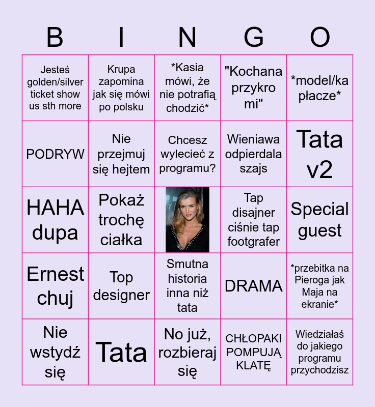 This bingo card has a free space and 24 words: Top designer, Tata, Chcesz wylecieć z programu?, Nie wstydź się, *model/ka płacze*, Jesteś golden/silver ticket show us sth more, PODRYW, Krupa zapomina jak się mówi po polsku, Tap disajner ciśnie tap footgrafer, Smutna historia inna niż tata, Wieniawa odpierdala szajs, HAHA dupa, DRAMA, *przebitka na Pieroga jak Maja na ekranie*, Nie przejmuj się hejtem, CHŁOPAKI POMPUJĄ KLATĘ, Special guest, *Kasia mówi, że nie potrafią chodzić*, Tata v2, Pokaż trochę ciałka, Wiedziałaś do jakiego programu przychodzisz, Ernest chuj, "Kochana przykro mi" and No już, rozbieraj się.