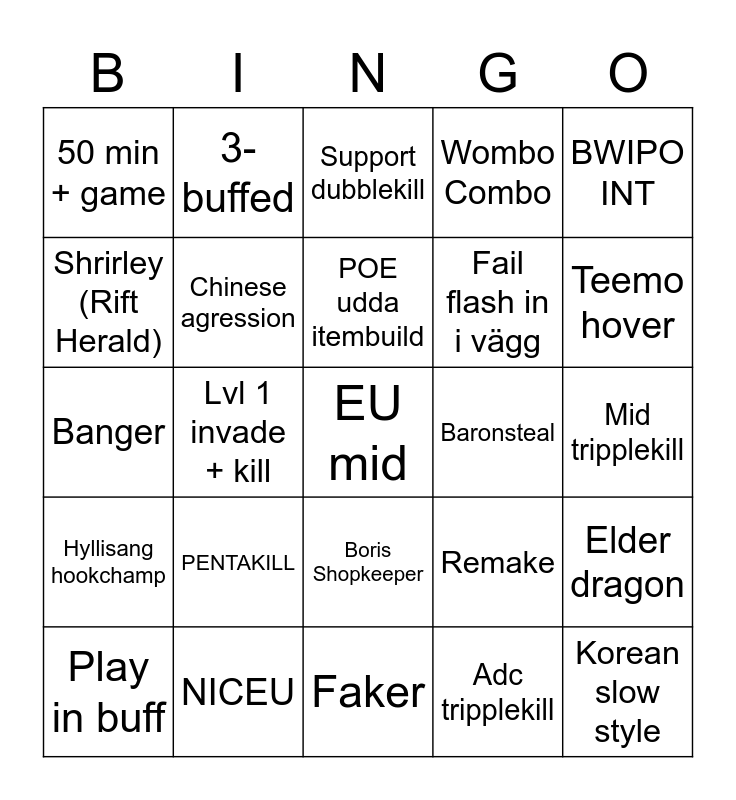 This bingo card has a free space and 24 words: PENTAKILL, NICEU, POE udda itembuild, Play in buff, BWIPO INT, 50 min + game, Shrirley (Rift Herald), 3-buffed, Baronsteal, Boris Shopkeeper, Fail flash in i vägg, Banger, Remake, Elder dragon, Chinese agression, Adc tripplekill, Mid tripplekill, Support dubblekill, Teemo hover, Lvl 1 invade + kill, Korean slow style, Hyllisang hookchamp, Wombo Combo and Faker.