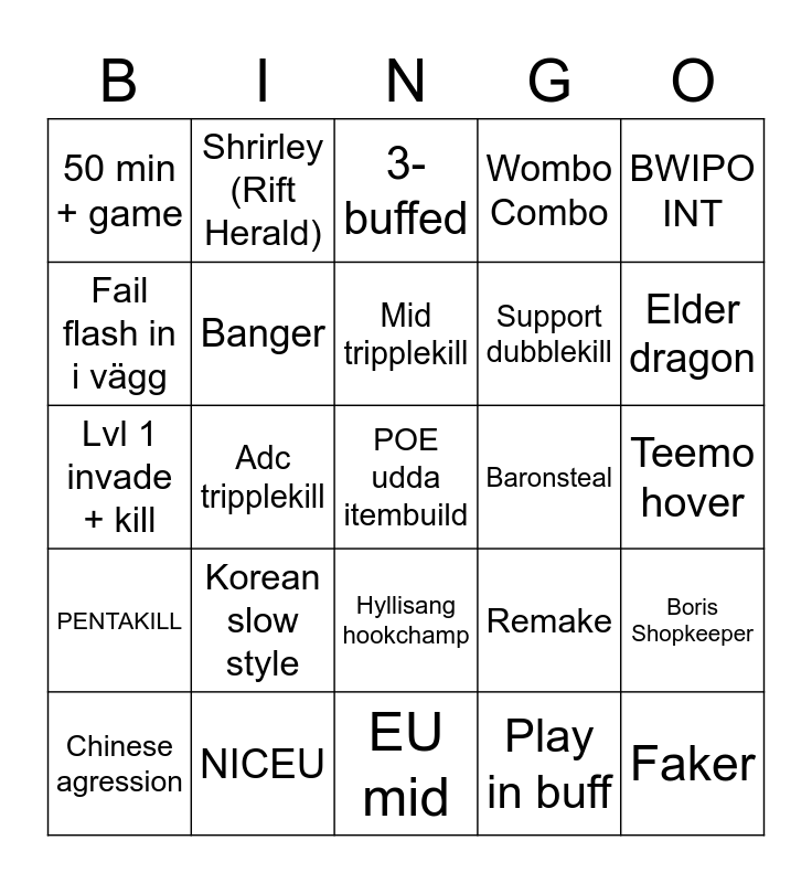 This bingo card has 25 words: PENTAKILL, NICEU, POE udda itembuild, Play in buff, BWIPO INT, 50 min + game, Shrirley (Rift Herald), 3-buffed, Baronsteal, Boris Shopkeeper, Fail flash in i vägg, Banger, EU mid, Remake, Elder dragon, Chinese agression, Adc tripplekill, Mid tripplekill, Support dubblekill, Teemo hover, Lvl 1 invade + kill, Korean slow style, Hyllisang hookchamp, Wombo Combo and Faker.