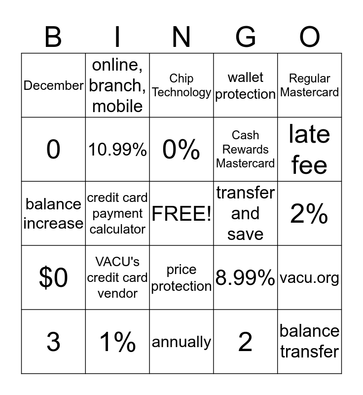 This bingo card has a free space and 24 words: VACU's credit card vendor, 1%, 0%, 3, Regular Mastercard, December, 0, online, branch, mobile, transfer and save, price protection, Cash Rewards Mastercard, balance increase, 8.99%, vacu.org, 10.99%, 2, 2%, Chip Technology, late fee, credit card payment calculator, balance transfer, $0, wallet protection and annually.