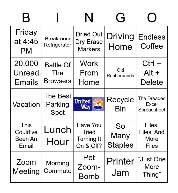 This bingo card has a free space and 101 words: Jean Friday, Coveted Window Spot, Endless Coffee, Scientific Calculator, Where Did That Paper Go?, Smallest Font In The World, Uneditable PDF, Motivational Posters, You’ve Got Mail, Wednesday Afternoon, Back To Back Meetings, Payday, I’m Gonna Need You To Come In This Weekend, Monday Morning, Large Print, ASAP, This Could’ve Been An Email, New Office Supplies, Breakroom Microwave, Snow Day, Where’s White Out When You Need it?, Mail Merge, Secret B-Day Card Envelope, Which Password Is This Again?, Morning Alarm, Ctrl + Alt + Delete, Driving Home, Lunch Hour, Blinking IM, Rare Color Copies, Breakroom Refrigerator, Dried Out Dry Erase Markers, Where Is The Meeting?, Boiling Hot Or Freezing Cold, Mountains of Paperclips, Have You Tried Turning It On & Off?, Standing Desk, When Was The Last Time I Stood Up?, Printer Jam, Pet Zoom-Bomb, Per My Last Email, Zoom Meeting, Where’s Unmute?!, Office Wear, We Know You Wear Pajama Pants On Zoom, “Just One More Thing”, Papercut, 2 Day Delivery, Last Minute Meeting, Can You Send Me That?, That One Space In Word You Can’t Get Rid Of, 20,000 Unread Emails, Inter Office Mail, Swivel Chairs, That’s What I Brought For Lunch?!, Is it HDMI or VGA?, “Please Load Paper” Roulette, Junk Mail, Dual Monitors, Office Pot-Luck, Battle Of The Browsers, Your Favorite Pen, Post-It Notes, So May Post-It Notes, Reply All, Staying Late, Old Rubberbands, Best Co-Workers Ever, The Best Parking Spot, Morning Commute, On Hold Music, That 2PM Feeling, Unending Email String, Friday at 4:45 PM, Leaving Early, Work From Home, Vacation, Angry Resident, “When You Have A Minute”, Office Candy Dish, All Those Voicemails, I Believe That’s My Stapler, PowerPoint Presentation, Recycle Bin, Blue or Black Ink, Out Of Office Message, Critically Low Battery, The Dreaded Excel Spreadsheet, Three Day Weekend, Now Where Did I Save That?, New Work From Home Co-Workers, So Many Staples, Office Wear, Snack Break!, Definitely Send To Voicemail, What’s A Fax Machine?, Files, Files, And More Files, So Many Staples, The Best Parking Spot, PIZZA PARTY, To-Do Lists and Undeliverable Email.