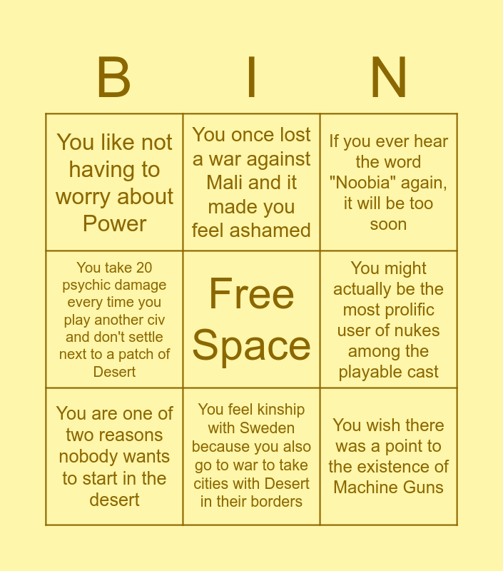 This bingo card has a free space and 8 words: You might actually be the most prolific user of nukes among the playable cast, If you ever hear the word "Noobia" again, it will be too soon, You once lost a war against Mali and it made you feel ashamed, You are one of two reasons nobody wants to start in the desert, You like not having to worry about Power, You wish there was a point to the existence of Machine Guns, You take 20 psychic damage every time you play another civ and don't settle next to a patch of Desert and You feel kinship with Sweden because you also go to war to take cities with Desert in their borders.