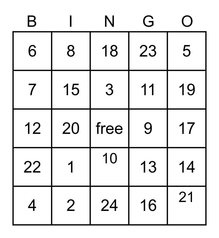 This bingo card has a free space and 24 words: 1, 2, 3, 4, 5, 6, 7, 8, 9, 10, 11, 12, 13, 14, 15, 16, 17, 18, 19, 20, 21, 22, 23 and 24.