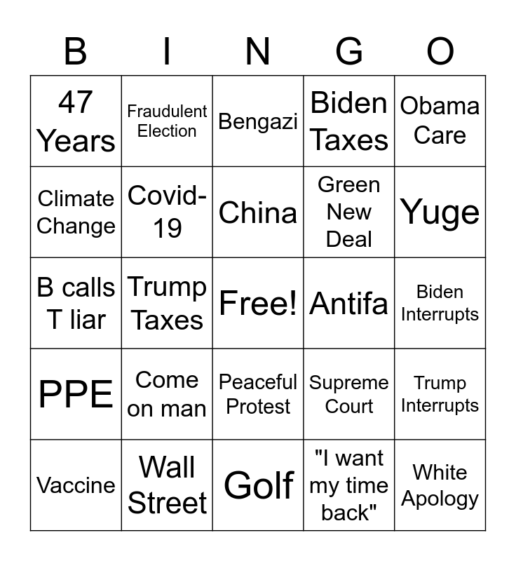 This bingo card has a free space and 36 words: Hunter Biden, Social Distance Fail, North Korea, Covid-19, Supreme Court, PPE, China, Military, Obama Care, The Wall, Trump Taxes, Biden Taxes, BLM, Antifa, Yuge, 47 Years, Incoherent Sentence, Come on man, White Apology, Bengazi, Biden Interrupts, Trump Interrupts, Wall Street, Vaccine, Golf, Fraudulent Election, B calls T liar, T calls B liar, Green New Deal, Climate Change, Moderator has to retake control, Big Pharma, "I want my time back", Peaceful Protest, Space Force and Mask.