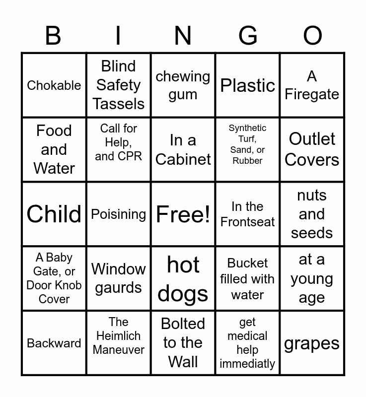 This bingo card has a free space and 24 words: Backward, Window gaurds, In a Cabinet, get medical help immediatly, A Firegate, Chokable, Blind Safety Tassels, chewing gum, In the Frontseat, nuts and seeds, Child, Call for Help, and CPR, Bucket filled with water, at a young age, Food and Water, The Heimlich Maneuver, Bolted to the Wall, Plastic, Outlet Covers, A Baby Gate, or Door Knob Cover, Poisining, hot dogs, Synthetic Turf, Sand, or Rubber and grapes.