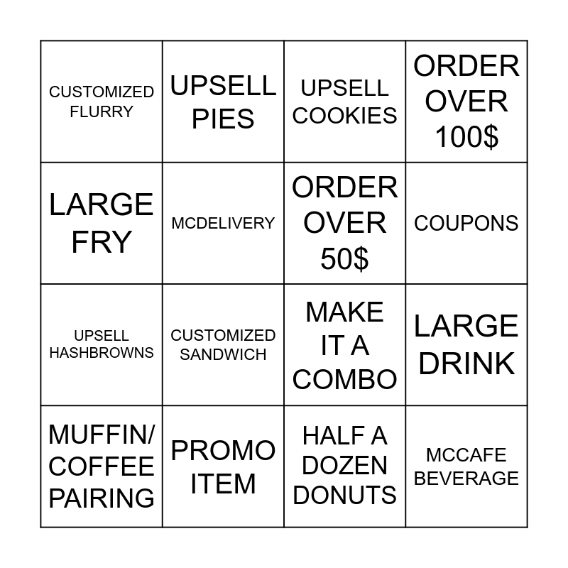 This bingo card has 16 words: PROMO ITEM, LARGE DRINK, UPSELL COOKIES, CUSTOMIZED FLURRY, UPSELL HASHBROWNS, UPSELL PIES, MAKE IT A COMBO, HALF A DOZEN DONUTS, LARGE FRY, MCDELIVERY, MUFFIN/ COFFEE PAIRING, ORDER OVER 100$, CUSTOMIZED SANDWICH, COUPONS, ORDER OVER 50$ and MCCAFE BEVERAGE.
