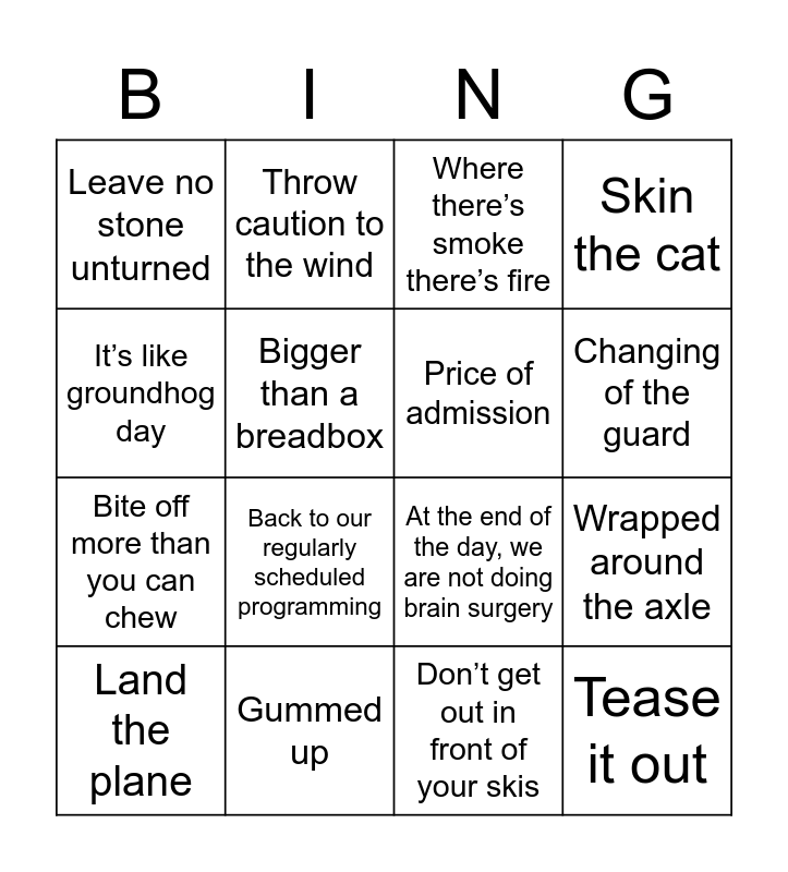 This bingo card has 16 words: Gummed up, Wrapped around the axle, Where there’s smoke there’s fire, Leave no stone unturned, Bite off more than you can chew, Throw caution to the wind, At the end of the day, we are not doing brain surgery, Don’t get out in front of your skis, It’s like groundhog day, Bigger than a breadbox, Land the plane, Skin the cat, Back to our regularly scheduled programming, Changing of the guard, Price of admission and Tease it out.