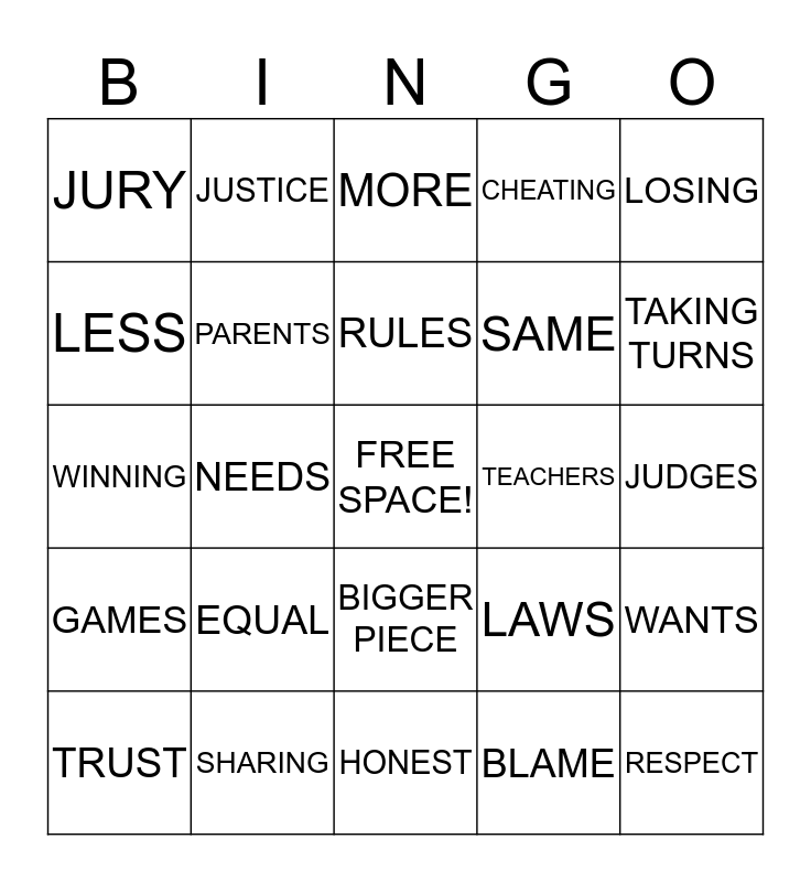 This bingo card has a free space and 24 words: EQUAL, SHARING, RULES, TRUST, LOSING, JURY, LESS, JUSTICE, TEACHERS, BIGGER PIECE, SAME, WINNING, LAWS, WANTS, PARENTS, BLAME, JUDGES, MORE, TAKING TURNS, NEEDS, RESPECT, GAMES, CHEATING and HONEST.